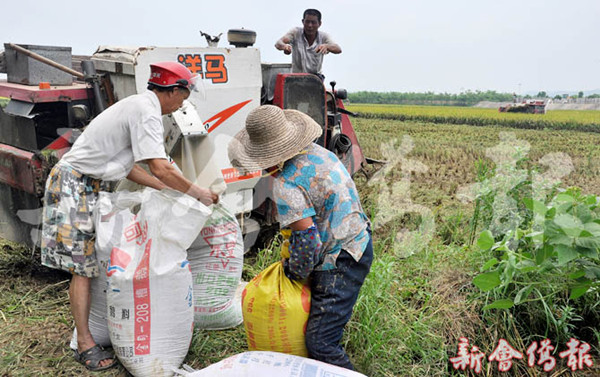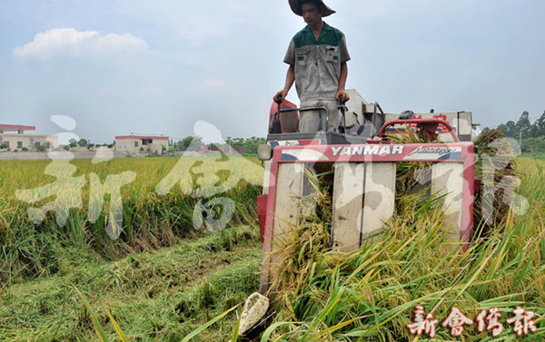 陽光下,一片片金黃的稻穗飽滿地彎下了腰,空氣中夾雜著翻滾泥土的芳香。田野間,幾部收割機不停地在馳騁,農民坐在田頭乘涼,等待收割機收獲一蘿蘿碩果。