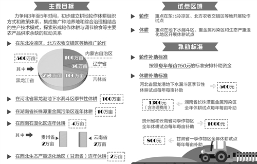 在試點目標上,輪作面積500萬畝,其中黑龍江250萬畝、內蒙古100萬畝、吉林100萬畝、遼寧50萬畝;休耕116萬畝,其中河北省黑龍港地下水漏鬥區季節性休耕100萬畝,湖南省長株潭重金屬污染區連年休耕10萬畝,貴州省和雲南省石漠化區連年休耕4萬畝,甘肅省生態嚴重退化地區連年休耕2萬畝。力爭用3年至5年時間,初步建立耕地輪作休耕組織方式和政策體係,集成推廣種地養地和綜合治理相結合的生產技術模式,探索形成輪作休耕與調節糧食等主要農產品供求余缺的互動關係。