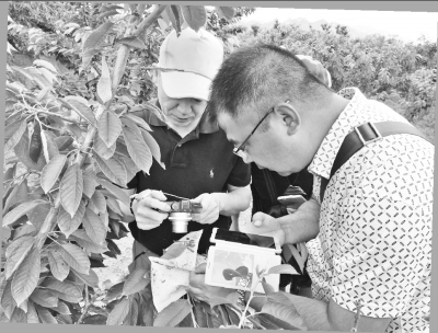 趙中華和黃家興分別是來自全國農業技術推廣服務中心和中國農業科學院蜜蜂研究所的兩位研究員,也是這片示范區的技術顧問。一來到石河鎮陳莊村,他倆就一頭扎進櫻桃園里,趙中華對著粘蟲板、誘捕器仔細找起果蠅來,黃家興則認真比對蜜蜂授粉後的櫻桃果型有何不同。