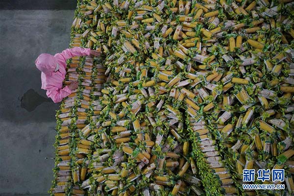 7月21日,山東廣饒縣廣饒街道的農民在山東貝爾康現代農業有限公司整理甜糯玉米。山東廣饒縣廣饒街道的農民,通過土地流轉,將自己的土地租給當地的致富帶頭人,自己則變身產業工人,到農業企業去工作。通過土地流轉集約化耕種、經濟作物的深加工,當地農民收入穩步增加。新華社記者 邢廣利 攝