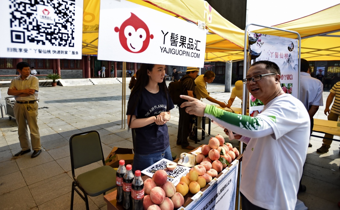 7月28日,平谷區劉家店鎮服務果農的電商平臺“丫髻果品匯”的員工在介紹網購鮮桃。
