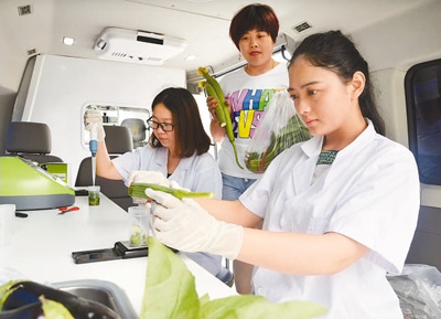 6月30日,冠縣食品藥品監督管理局檢測中心工作人員在食品安全檢測車內對抽取的蔬菜樣品進行食品安全快速檢測。