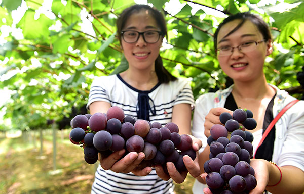 7月28日,市民在大圩鎮葡萄園里展示採摘的葡萄。