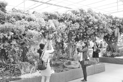 近日,北京市花木有限公司研發中心展出了用于北京世界園藝博覽會的千余種花卉,涵蓋專業化種苗、家庭園藝無性係新品種、花壇花卉、宿根花卉。在上千個品種中,有針對延慶篩選出的不同類型的耐寒或喜冷涼一二年生花卉品種。除了新奇的品種外,此次展示還採用了豐富多樣的花卉應用形式,如用容器栽培的垂吊的海棠和角堇,用宿根和花灌木展現的春夏秋冬的宿根花境,以蝴蝶蘭等蘭科植物為主營造的熱帶雨林小環境等。圖為遊客在展區觀賞鮮花。 鄧薈雯攝