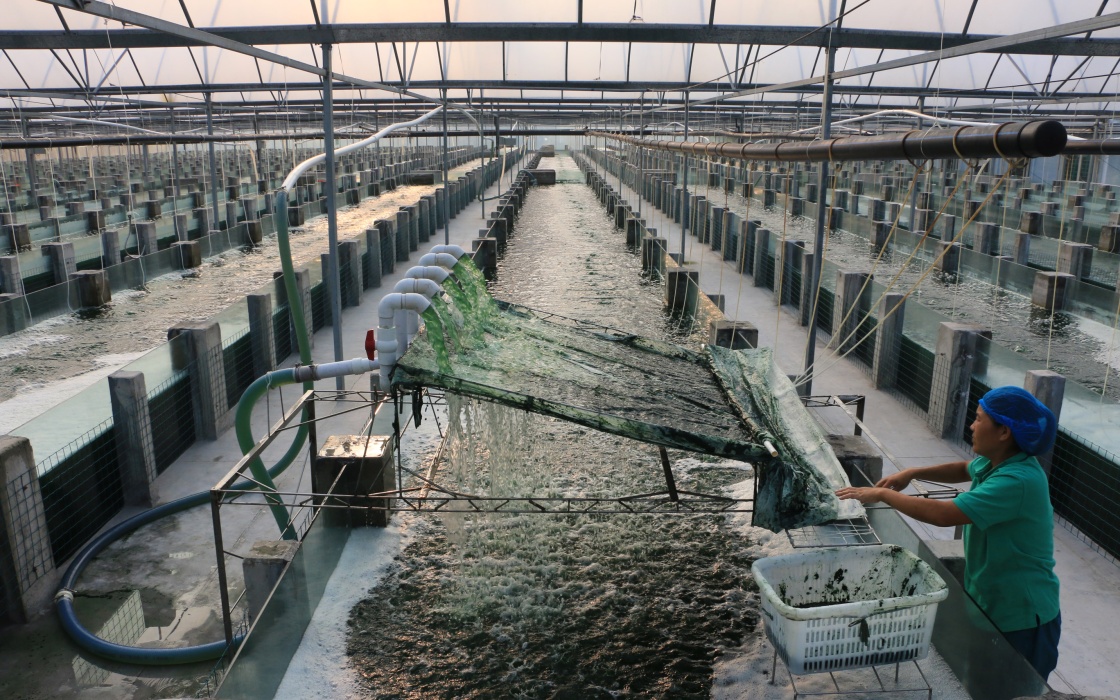 8月3日,在山東省鄒城市香城鎮螺旋藻養殖基地,工作人員清理藻池。