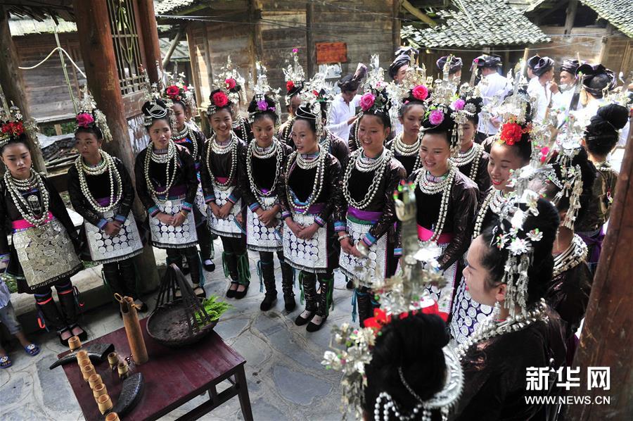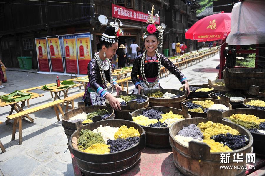 8月9日是貴州省從江縣銀潭侗寨一年一度的新米節,人們殺豬宰牛,開展侗族民俗表演、蕩秋千、唱侗歌等活動,並擺下侗家長桌宴,與賓客共度節日。新華社發(張琪攝)