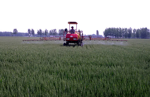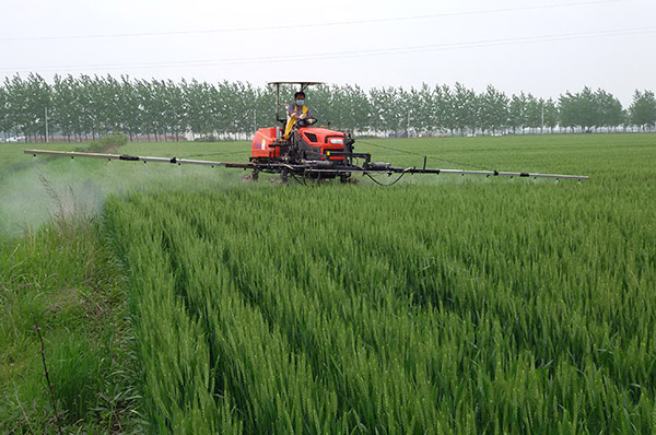 在安徽省宿州市埇橋區蒿溝鄉高灘村,意利達糧食產業化聯合體農民在對小麥進行除蟲作業(2016年5月1日攝)。
