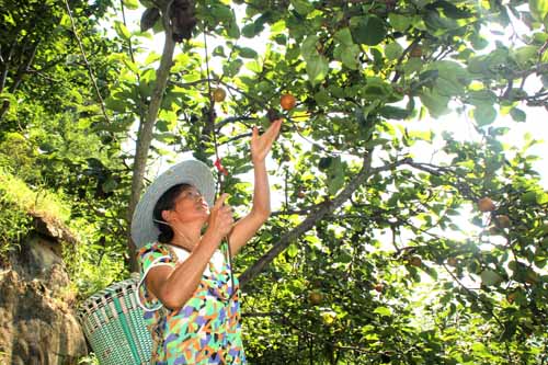 村民秦永芬正樂呵呵地在梨樹林里摘梨,她右手拿著鐵鉤,背上背著背兜,將挂在枝頭上的梨輕輕摘下,放進背兜里。