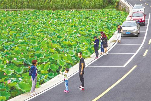 遊客在大觀鎮中江村賞花遊玩,拍照留影。 攝/張文強