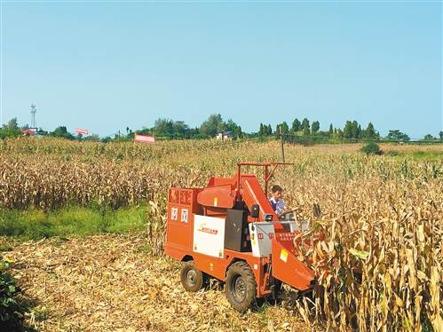 8月17日上午,保鄉村晴空萬里,正是收割的好天氣。一臺白色的小型玉米收割機在轟鳴聲中,將成熟的玉米植株割倒,前端的傳送裝置將帶穗皮的玉米棒子剝幹凈,將玉米粒掰下來,送到收割機後面的貯糧箱。