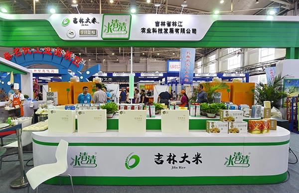 8月17日,市民在第十五屆長春農博會“長春大米”展區參觀選購。