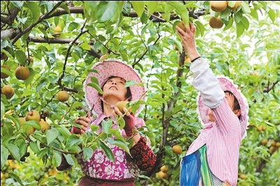 豐收季節,梨農們正忙著在梨園採摘成熟的梨果。