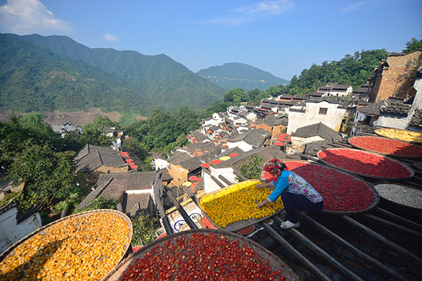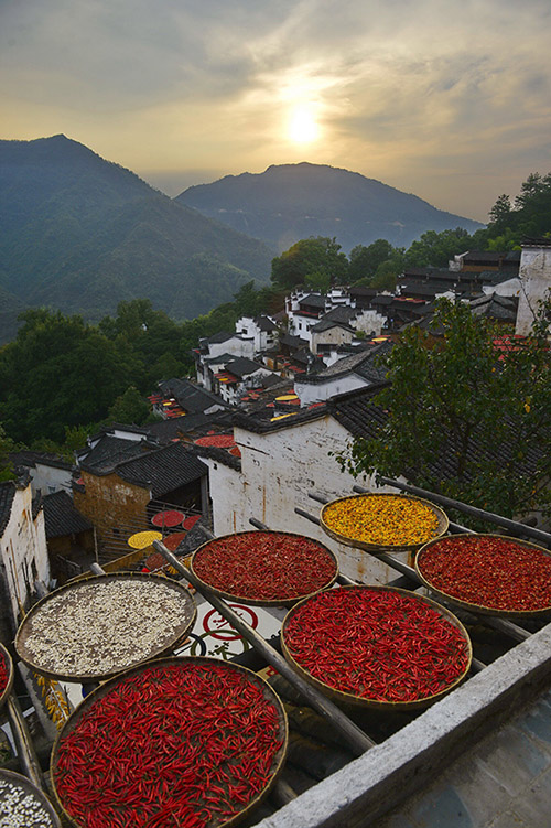 隨著秋季來臨,江西婺源篁嶺進入了曬秋季節。粉牆黛瓦配著村民晾曬出的紅辣椒和黃菊花等農產品,色彩繽紛,風景優美。