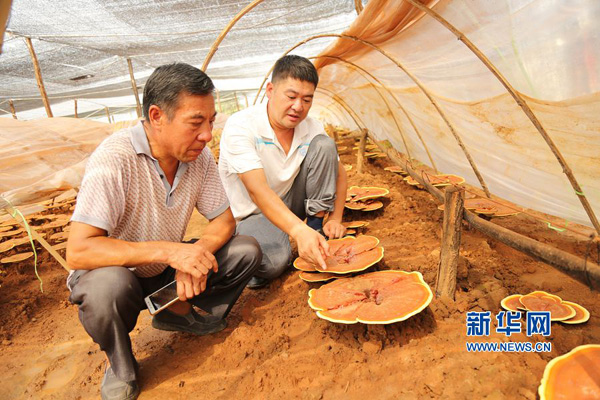 來自山區王坪鄉寶豐村的共產黨員、村委主任李小國在帶領大家種植靈芝,帶動當地農民走致富路。