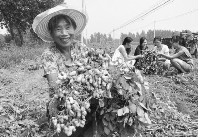 圖為東海縣農業資源開發項目區77歲鈕愛花大嬸高興地說:“‘液膜’加早熟良種無公害花生環保又高產。”
