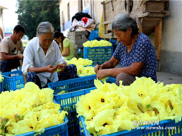 8月22日,歙縣富堨鎮青山村農民余金香正在擇揀黃蜀葵等待合同商收購。