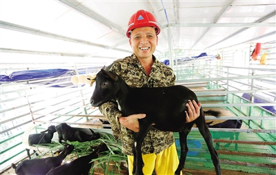8月24日,在瓊中黎族苗族自治縣灣嶺鎮大平村委會大邊村民小組,養殖戶抱著黑山羊笑得合不攏嘴。