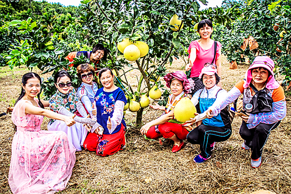 遊客在南豐鎮油文村委會石井村種植基地體驗採摘、品嘗紅心蜜柚樂趣。