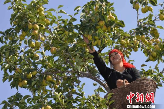9月5日上午,在新疆庫爾勒市沙依東園藝場果農阿不力坎木·斯麻衣果園里,採摘工巴哈爾古麗正在採摘香梨。當天,新疆庫爾勒香梨採摘工作全面啟動。目前,新疆庫爾勒市(含鐵門關市)香梨種植面積近70萬畝,年產量達到50萬噸,貯藏保鮮能力達40萬噸以上,創建庫爾勒香梨品牌18個,已經形成集香梨生產、加工、貯藏、保鮮、運輸一體的產業化發展格局。