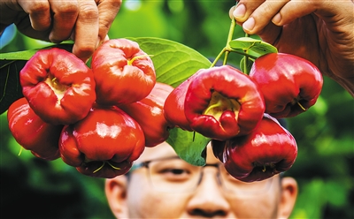 海口市雲龍鎮,“中國紅”蓮霧備受市場歡迎。