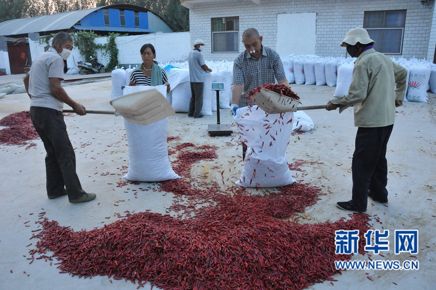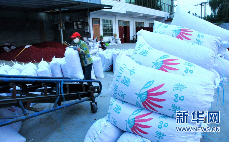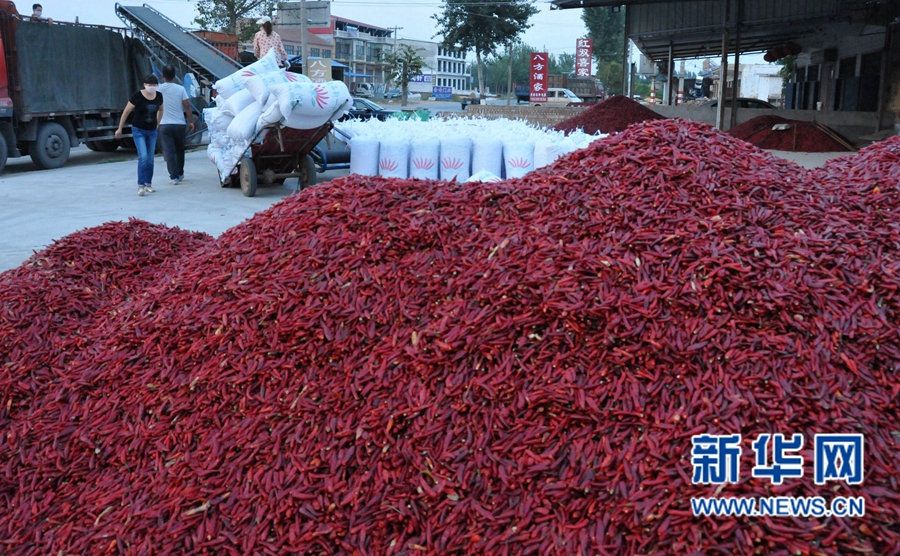 9月26日,內黃縣亳城鄉一家尖椒收購市場,工人們正在將尖椒打包,準備銷往外地。