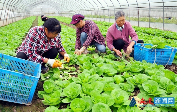 10月12日上午,在迎江區長風鄉一無公害蔬菜基地,菜農們正在採摘新鮮白菜。
