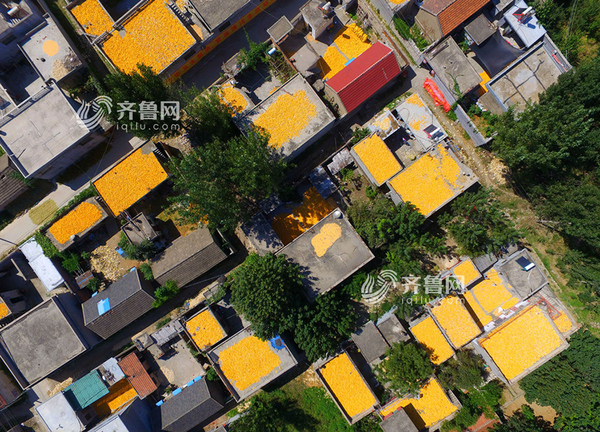 初秋時節,棗莊滕州某村的玉米種植戶迎來了豐收年,村民們抓緊農時,將玉米掰下收集起來,在房頂院前曬出辛勞一季的成果。從空中俯瞰,一片片金黃色的玉米點綴山鄉村落,放眼望去家家戶戶盡是“黃金屋頂”,構成了一張巨大的“調色盤”,四處洋溢著玉米香。