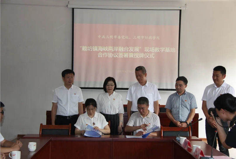 海峽兩岸農業合作網訊 6月28日,三明市委黨校(市行政學院、市社會主義學院)“賴坊海峽兩岸融合發展”現場教學基地合作協議簽署暨授牌儀式在賴坊鎮舉行。市委黨校(市行政學院、市社會主義學院)副校(院)長陳沈慧,挂鎮領導、縣人大常委會副主任李興榮及縣委黨校、清流臺創園、賴坊鎮相關負責人出席活動。