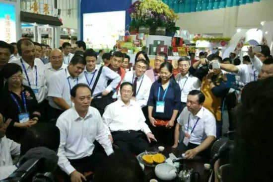農業部副部長余欣榮參觀海峽兩岸農業合作展區,與眾多臺商臺農一起品茗聊天。(圖片由漳平臺商聯誼會會長李志鴻提供)