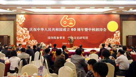 A reception is held by counselors and culture and history researchers of China's cabinet to celebrate the upcoming 60th founding anniversary of the People's Republic of China and the traditional Mid-Autumn Festival, in Beijing, capital of China, Sept. 28, 2009. (Xinhua/Zhang Duo)