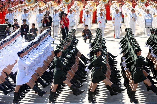 媹emale soldiers of the three services of the Chinese People's Liberation Army march in a parade of the celebrations for the 60th anniversary of the founding of the People's Republic of China, in central Beijing, capital of China, Oct. 1, 2009. (Xinhua/Li Xiaoguo)
