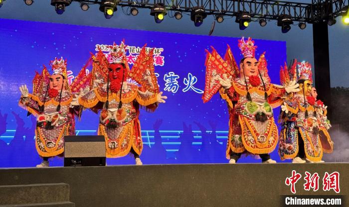 中新網昆山6月1日電 (記者 鐘升)端午假期,海峽兩岸交流基地昆山慧聚廣場上電音陣陣。來自臺灣新北、臺北、新竹、苗栗以及廣東等地的16隊電音三太子團接力登場。“哪吒”們以激昂的節奏與精湛的舞技,展開了“2025首屆昆山媽祖杯電音三太子大賽”的比拼。