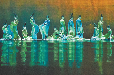 在女性角色的舞蹈編排上,我們以靜為出發點,以內斂、內收為基調,設計了不少造型動作,如靜待、望月、垂思、獨步、險峰、臥石。織絹人“唱絲”段落,是我們研究了一幅宋代《蠶織圖》後的結果。青綠的一段群舞,我們借用“畫中山石”的概念,將《千里江山圖》的山石化入群舞,凸顯山石輪廓的硬朗感。在舞臺設計方面,我們以同心圓為舞臺軸心,採用地面轉臺和空中圓弧機械動作,天旋達到三圈,地轉達到四圈,上下左右都可以進行移動。古往今來、戲里戲外、臺上臺下,文脈與情感在這動靜交替中相連。