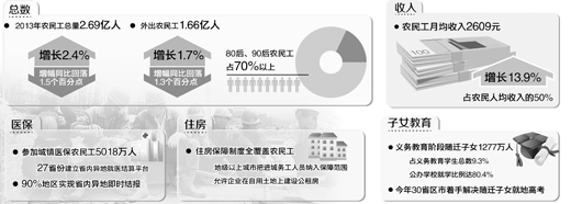 教育問題也是農民工非常關心的問題。教育部基礎教育一司副司長杜柯偉介紹,以公辦學校為主接收隨遷子女就學的格局已經基本形成。截至2013年年底,全國義務教育階段的隨遷子女一共是1277萬人,佔到義務教育學生總數的9.3%。在公辦學校就學的比例,2013年達到了80.4%,比2012年略有提升。除了在公辦學校就讀以外,上海、浙江一些地方還採取由政府向民辦學校購買學額的方式,共有39萬在民辦學校就讀的學生享受了政府購買學額的服務。國家財政性教育經費保障隨遷子女就學的比例已經達到了83.5%。