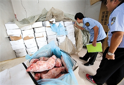 執法人員在檢查泡制豬蹄的水池。