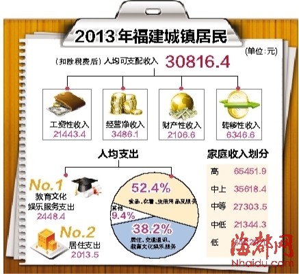 東南網1月21日訊(海峽都市報記者 楊陽)去年我省老百姓掙了多少錢?錢都花在了哪兒?國家統計局福建調查總隊20日發布數據顯示,2013年,福建城鎮居民人均可支配收入首次突破3萬元,農村居民人均純收入首次突破1萬元。而消費方面,城鎮人均消費支出首次突破2萬元,其中花錢最多的是教育文化娛樂服務2448.4元,高于居住消費2013.5元。