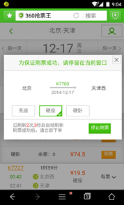 在簡單輸入出發地、目的地與出發日期後,360手機衛士搶票版即可實現自動刷票。數據顯示,通過360手機衛士五秒自動刷票模式,平均每十分鐘就能幫用戶搶到2萬多張車票。刷票成功後,即可立即下單成功購票。而當用戶在刷票過程中突然接到電話等不小心離開刷票界面,360手機衛士搶票專版會在一段時間內保持原來的搶票頁面自動後臺運行,當再次進入刷票界面即可繼續搶票。