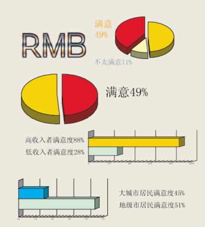 據悉,調查隨機抽取了3000位城鎮受訪者進行電話訪問。總體來看,對“本地經濟發展”表示“滿意”和“比較滿意”的受訪者,比例達49%,與2012年相比上升了4個百分點;表示“不滿意”與“不太滿意”的比例降至11%。受訪者對于“居民生活狀況”的評價兩年來保持穩定,本年滿意度為49%。