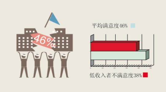 值得一提的是,不同人群的感受差距甚遠。低收入者對“居民生活狀況”的滿意度只有28%,而高收入者滿意度高達88%。對于“居民住房”,38%低收入者表示不滿意,但大城市居民的滿意度為38%。“居民就業”是低收入人群最不滿意的選項,不滿意度高達44%,滿意度僅17%。