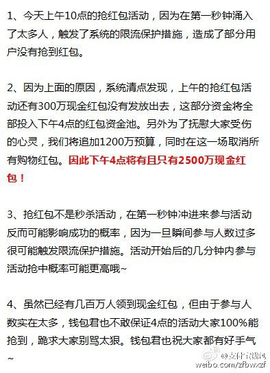 支付寶在清點之後發現還有300萬的現金紅包沒有發放,決定將這300萬現金增加到下午4點的活動中,並且額外增加1200萬的預算,這讓下午4點的活動中積攢了2500萬的紅包。