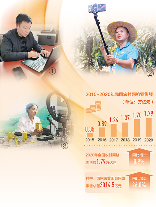 近年來,我國農村網絡零售額增長迅速,田江海、羅東等鄉村電商人才,成長為幫助農民增收致富的帶頭人。2020年,全國農村網絡零售額1.79萬億元,其中,全國832個國家級貧困縣網絡零售總額達3014.5億元。