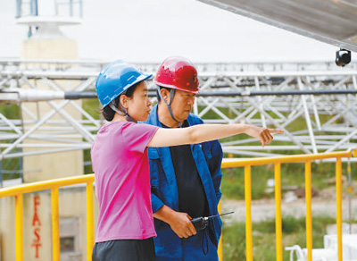“中國天眼”運行和發展中心機械組組長姚蕊(左)和維保人員在艙停靠平臺做升艙前的檢查。