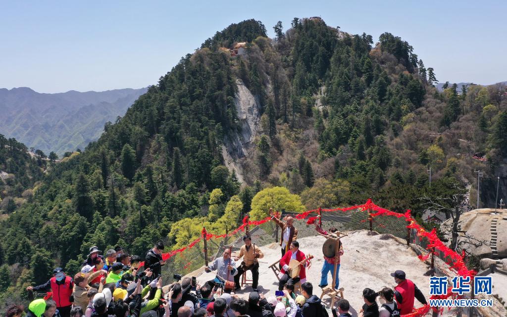 華山景區西峰索道“華陰老腔團”在華山西峰之巔為遊客表演(5月5日攝,無人機照片)。新華社記者 陶明 攝