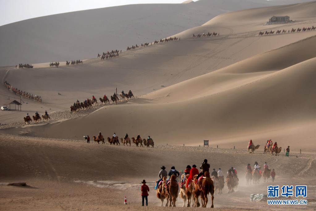 遊客在甘肅省敦煌市鳴沙山月牙泉景區遊覽(5月1日攝)。新華社發(張曉亮 攝)