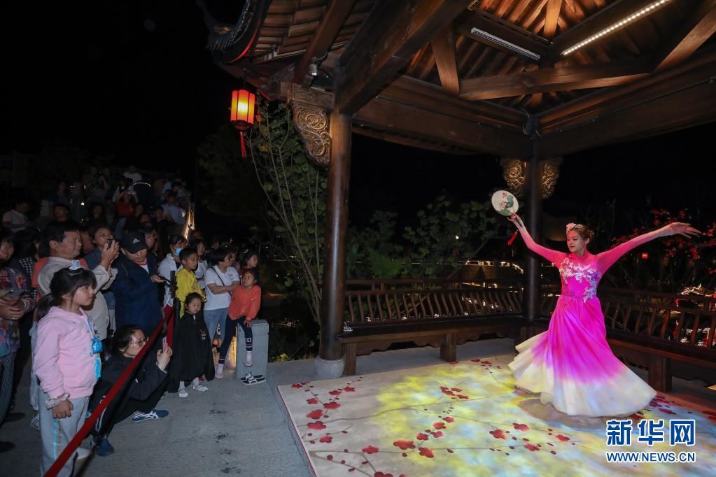 在浙江省建德市梅城鎮的嚴州古城,遊客觀看夜間表演(5月2日攝)。新華社記者 徐昱 攝