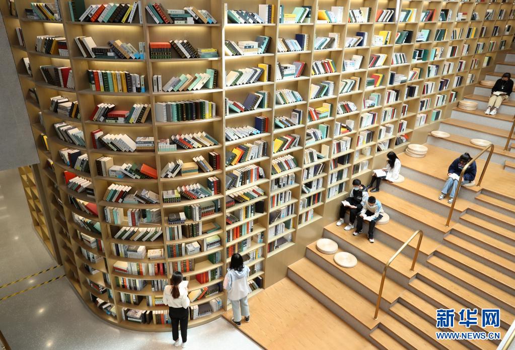 讀者在安徽省蒙城縣圖書館天梯書架旁閱讀書籍(5月2日攝)。新華社發(胡衛國 攝)