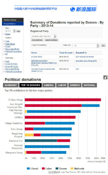 “澳大利亞政治捐款人,中國神秘男子居榜首”,《澳大利亞人報》3日以此為題報道稱,“王子春(音譯)”何許人也?這位神秘的中國捐贈人在2013年澳大利亞聯邦大選前向工黨陣營捐獻了85萬澳元。這是2013至2014財年中,澳大利亞各大黨派收到的最大一筆捐款。英國《衛報》3日調查稱,神秘人“王子春”與在維多利亞有重大開發項目的中國澳洲房地產集團——光大集團有關。更讓澳媒擔憂的是,2014財年,澳大利亞工黨收到的最大5筆捐款中,有4筆與中國有關。