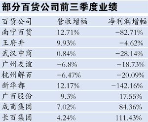 最新報告顯示,前三季度,王府井歸屬于上市公司股東的凈利潤5.23億元,同比下降4.62%;南寧百貨歸屬于上市公司股東的凈利潤840.68萬元,同比下降82.71%;武漢中商歸屬于上市公司股東的凈利潤3472.15萬元,同比下降28.14%;翠微大廈前三季度歸屬于上市公司股東的凈利潤為1.05億元,同比下滑8.35%。廣州友誼1~9月凈利為2.08億元,同比減少18.73%;杭州解百期內凈利為5235萬元,同比下降20.09%。