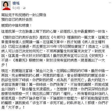 瓊瑤提到這是她人生最重要的一封信,明年將邁入80歲的她,認為自己沒因戰亂、意外、病痛等原因離開,一切都是上蒼給的恩寵,“所以,從此以後,我會笑看死亡”。並特別發出5點聲明叮嚀兒子,表示無論生什麼重病,她都不動大手術、不送加護病房、絕不能插鼻胃管,最後再次強調各種急救措施也不需要,只要讓她沒痛苦地死去就好。