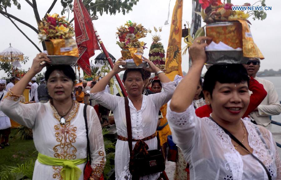 Balinese Hindus head for Melasti ceremony in Palembang, Indonesia, March 15, 2015. Balinese Hindus in Palembang hold Melasti ceremony to clean their soul before celebrating the Nyepi Day, the Balinese Day of Silence, that marks Balinese Hindu new year on March 21, 2015. (Xinhua/Nova Wahyudi)